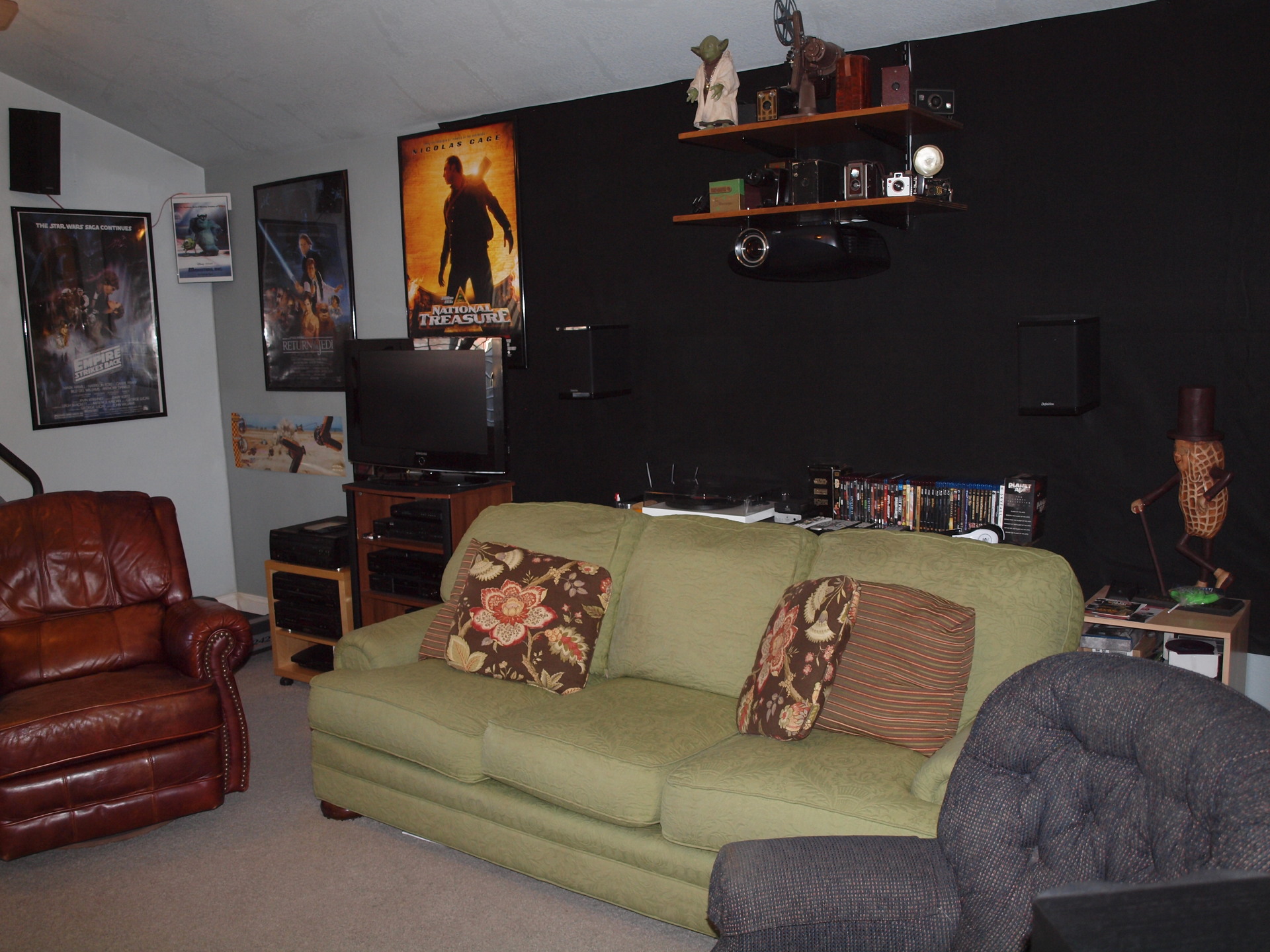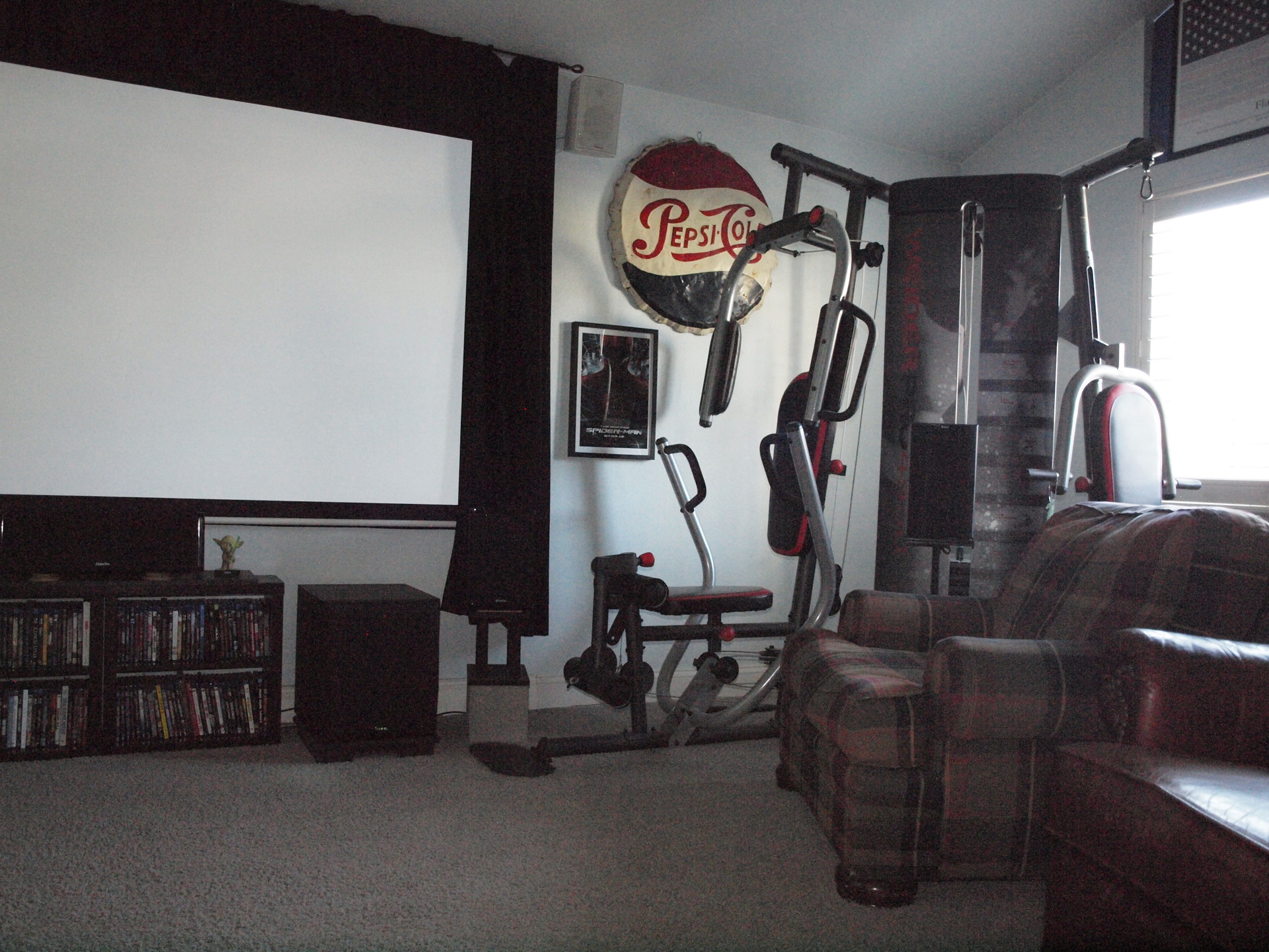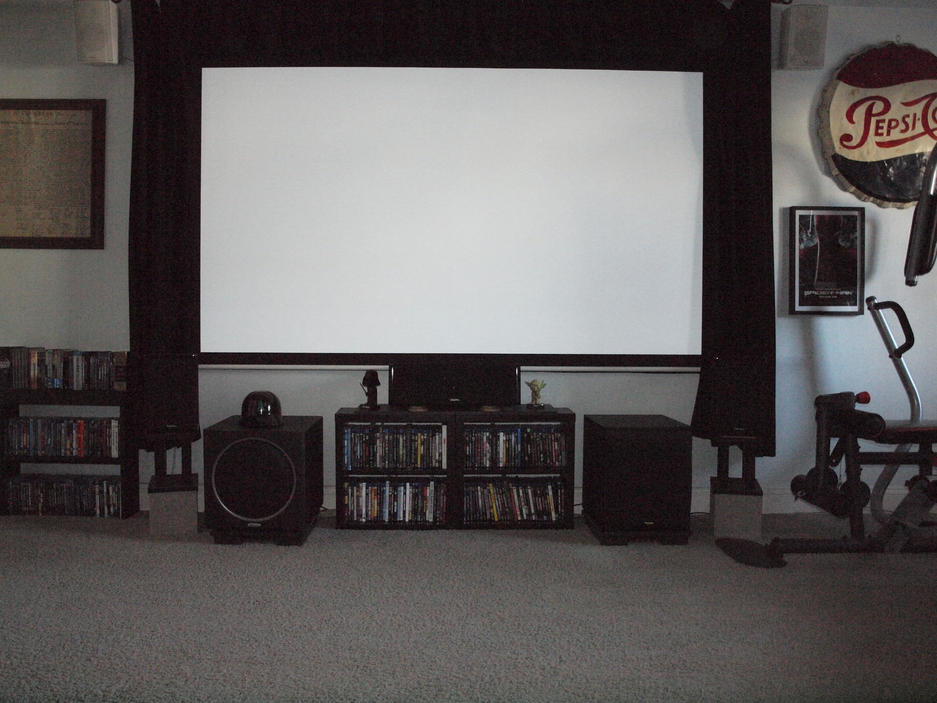 This is my dual screen set up. For movies there is a fixed 16:9 106" DIY Designer White laminate screen that is currently masked to 2.35:1, see above photo, and a manual 106" Da-Lite high power screen that pulls down in front of the fixed screen for sports and gaming. The sound is provided by Definitive Technology C/L/R 2002 center, StudioMonitor 450 fronts, BP2X surrounds, StudioMonitor 350 surround backs, B&W DM601 front wides, and Klipsch KSB 1.1 for front heights. The low end is provided by a Polk PSW125 and an Infinity PS-12. Uploaded Jan 20, 2014 17:28:06