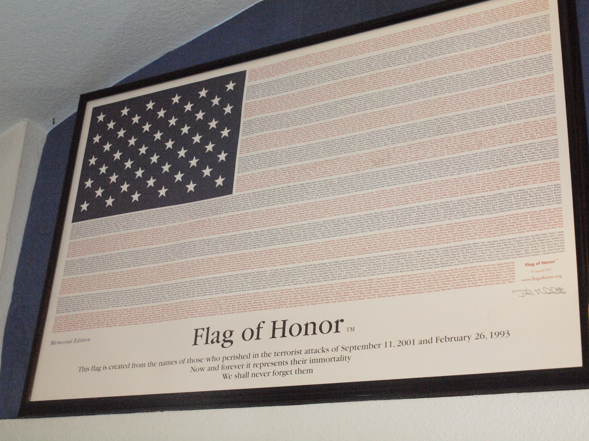 I picked this up when we visited "Ground Zero" on our vacation last summer. It is a flag made up of the names of the people that lost their lives that day. It reminds me of their sacrifice and how lucky my family and I are. Uploaded Sep 22, 2012 11:09:21