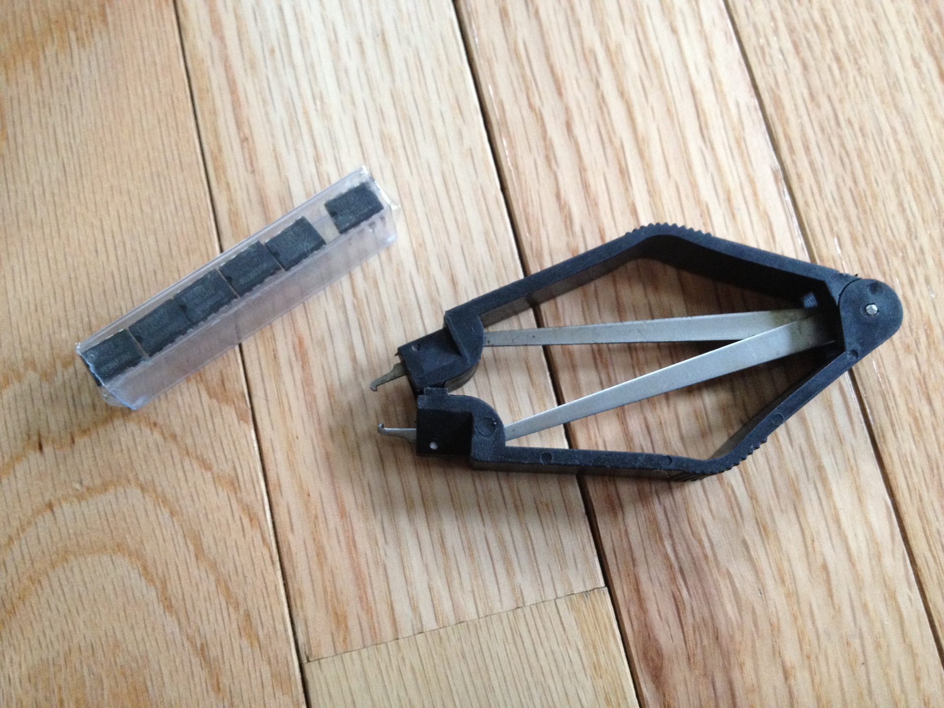 The six opamps (as packaged) and a nifty little tool I bought off of ebay to extract chips. Even though I only paid 1 dollar (including shipping), it was a waste as the opamps are so close to other components that the tool won't fit in. I recommend using a pair of needle nose pliers and GENTLY grabbing the chips and pulling them out. Uploaded Mar 14, 2012 17:05:45