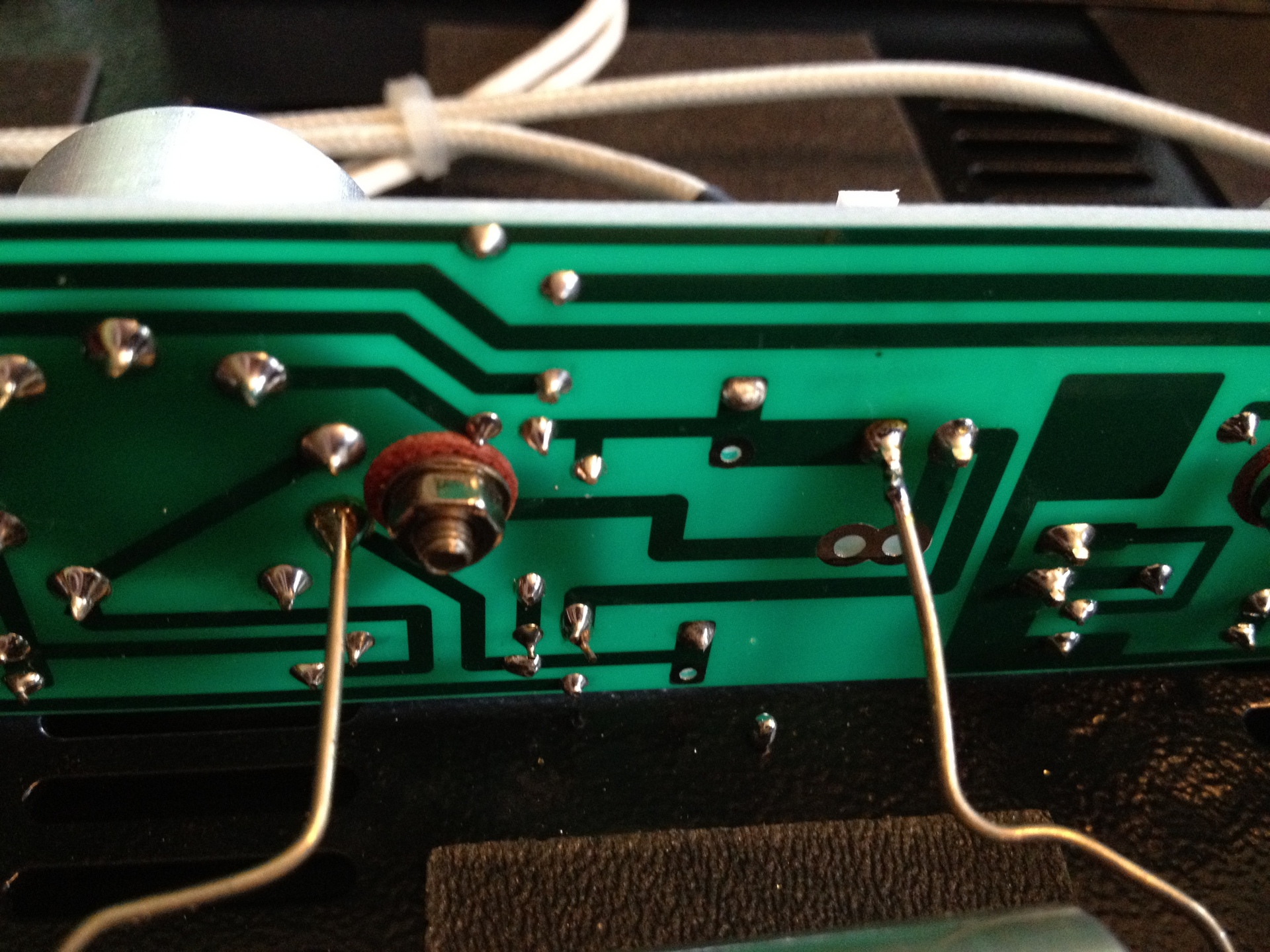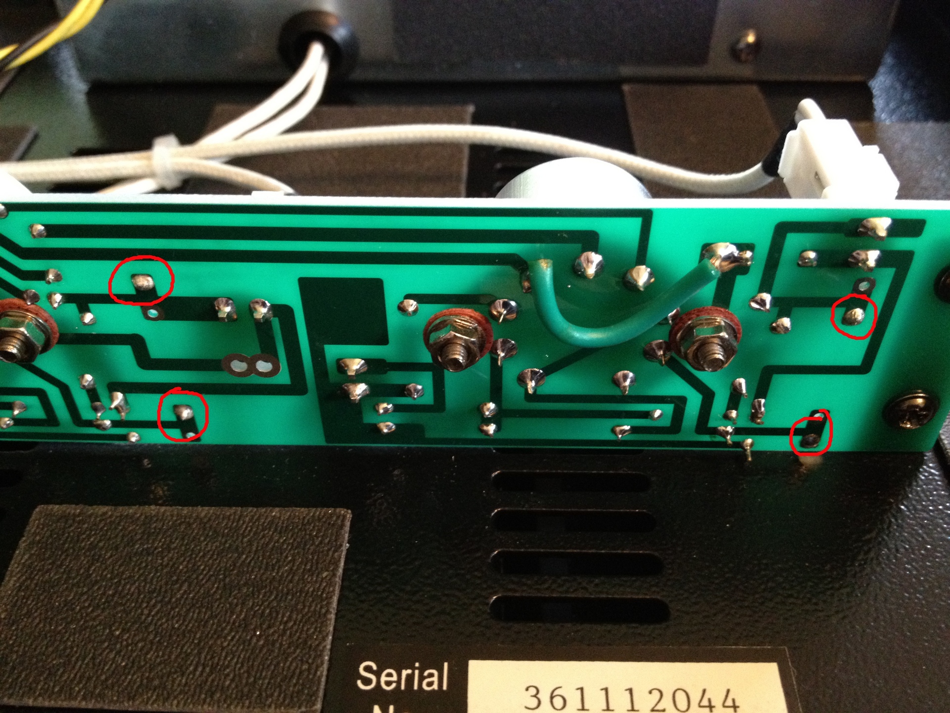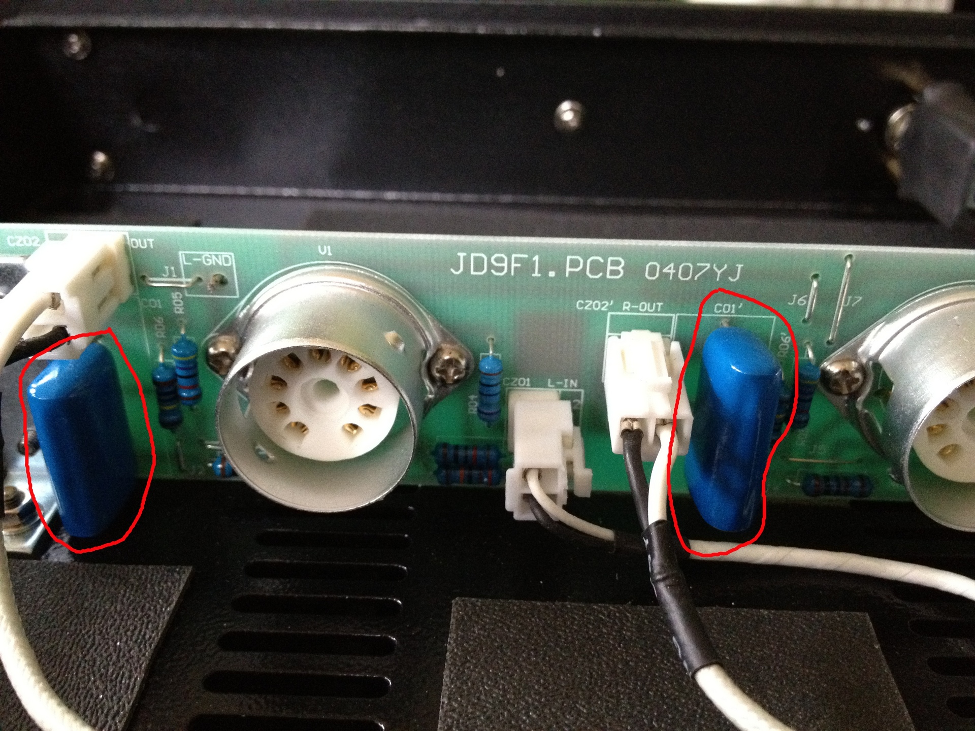 Ok, so here are the contact points that we're going to solder the new caps onto. Why not the original contact points of the old caps? Because, this will be a more direct connection and ideally the less length and connections in the circuit, the better the quality. Uploaded Mar 14, 2012 17:06:09