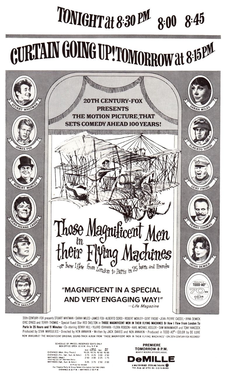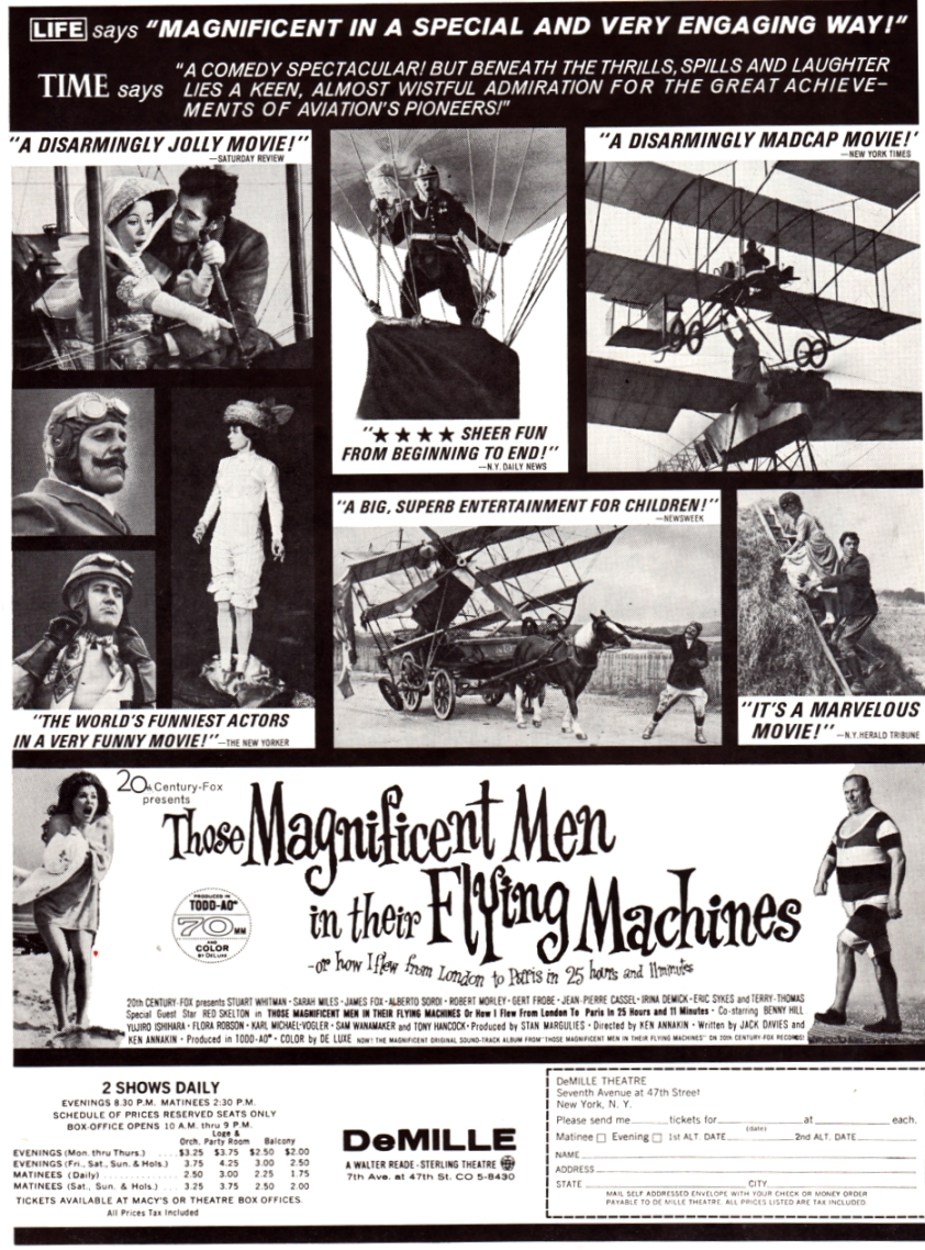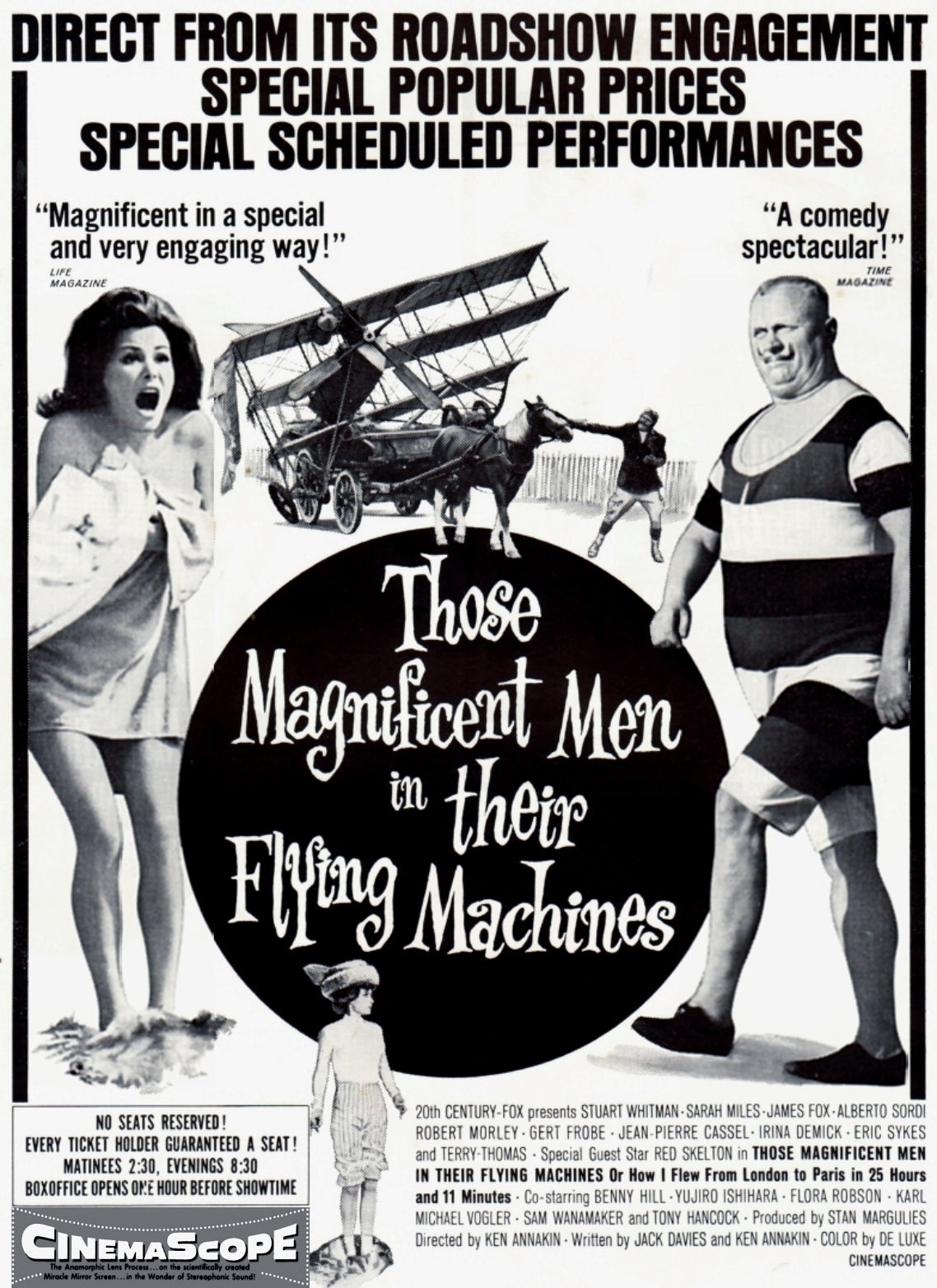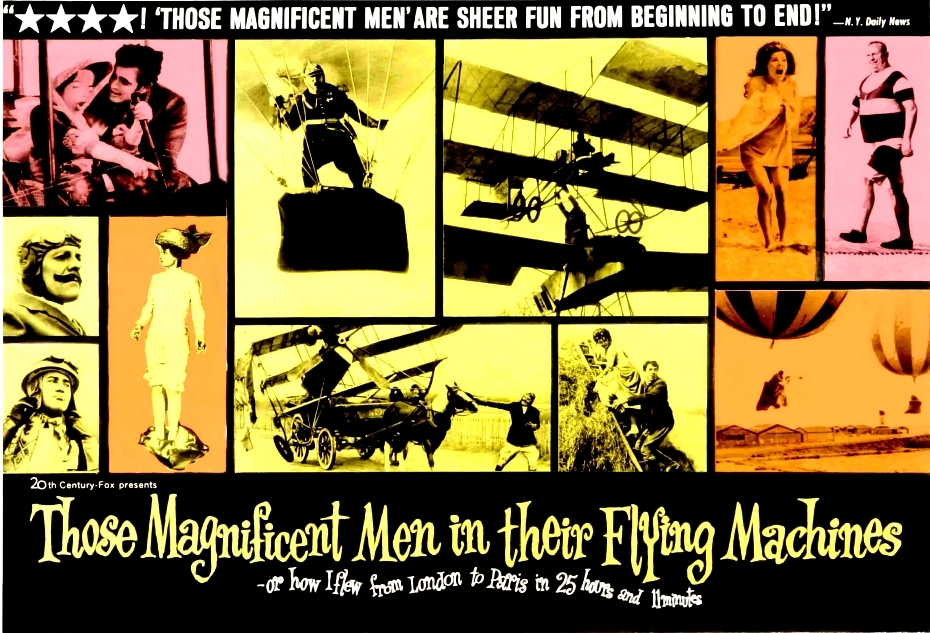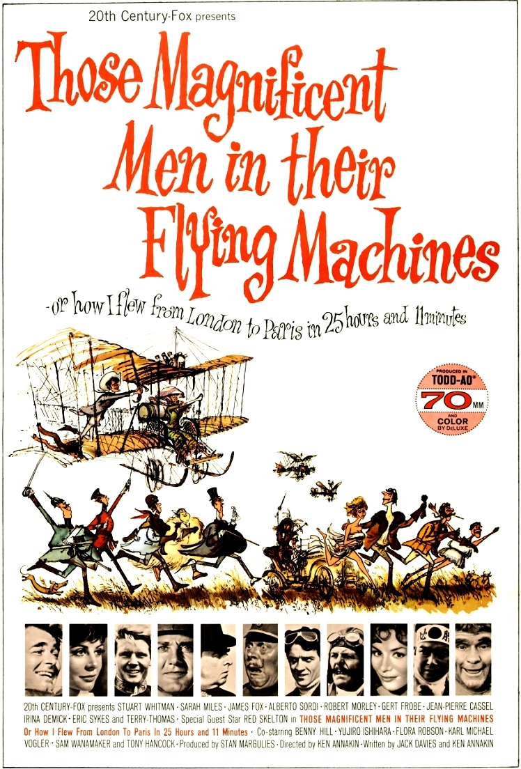 Those Magnificent Men in their Flying Machines, or: How I Flew from London to Paris in 25 Hours and 11 Minutes" is a film tribute, in the form of a comic valentine, to those daring men the world over who, at the beginning of the century, took to the air in the first outlandish flying machines. The production, in Todd-AO and CinemaScope and DeLuxe Color releases on Blu-ray from Twilight Time.