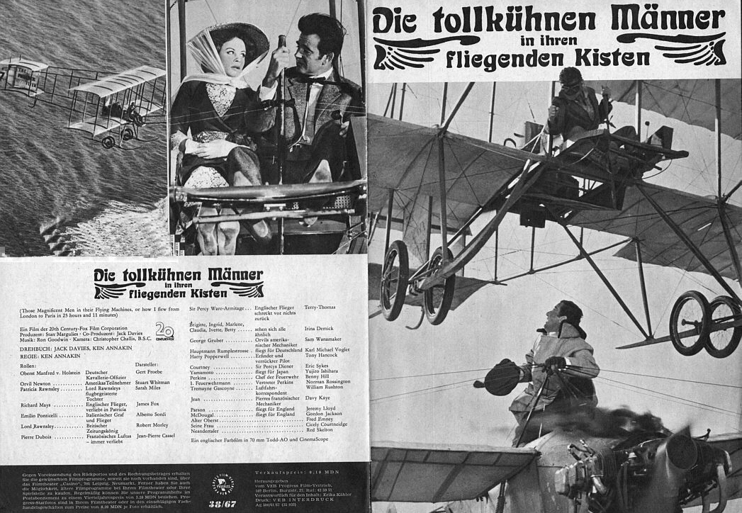 Producer Stan Margulies and director Ken Annakin carefuly provided not one, but two stand-ins for each of the planes in the film which are actually flown. Stand-in No. 1 remained ready to avoid production delay in case anything happened to its "star" counterpart. Stand-in No. 2 was especially constructed so that it could be pulled apart in sections to facilitate close-up filming. The 1910-vintage aeroplane could not get off the ground, with any degree of safety, in anything stronger than a 10-15 mile-per-hour breeze and the situation gave birth to a new cry from Assistant Director Clive Reed, when he frequently kidded the company by shouting: "Ready! Quiet! Roll 'em! HOLD BREATHING! Action" Two of the planes used can still be seen in the "Shuttleworth Collection" based at Old Warden, Bedfordshire. The Passat Ornithopter airplane in this movie was given to Cole Palen for promoting the picture. It can now be seen at the Old Rhinebeck Areodrome.